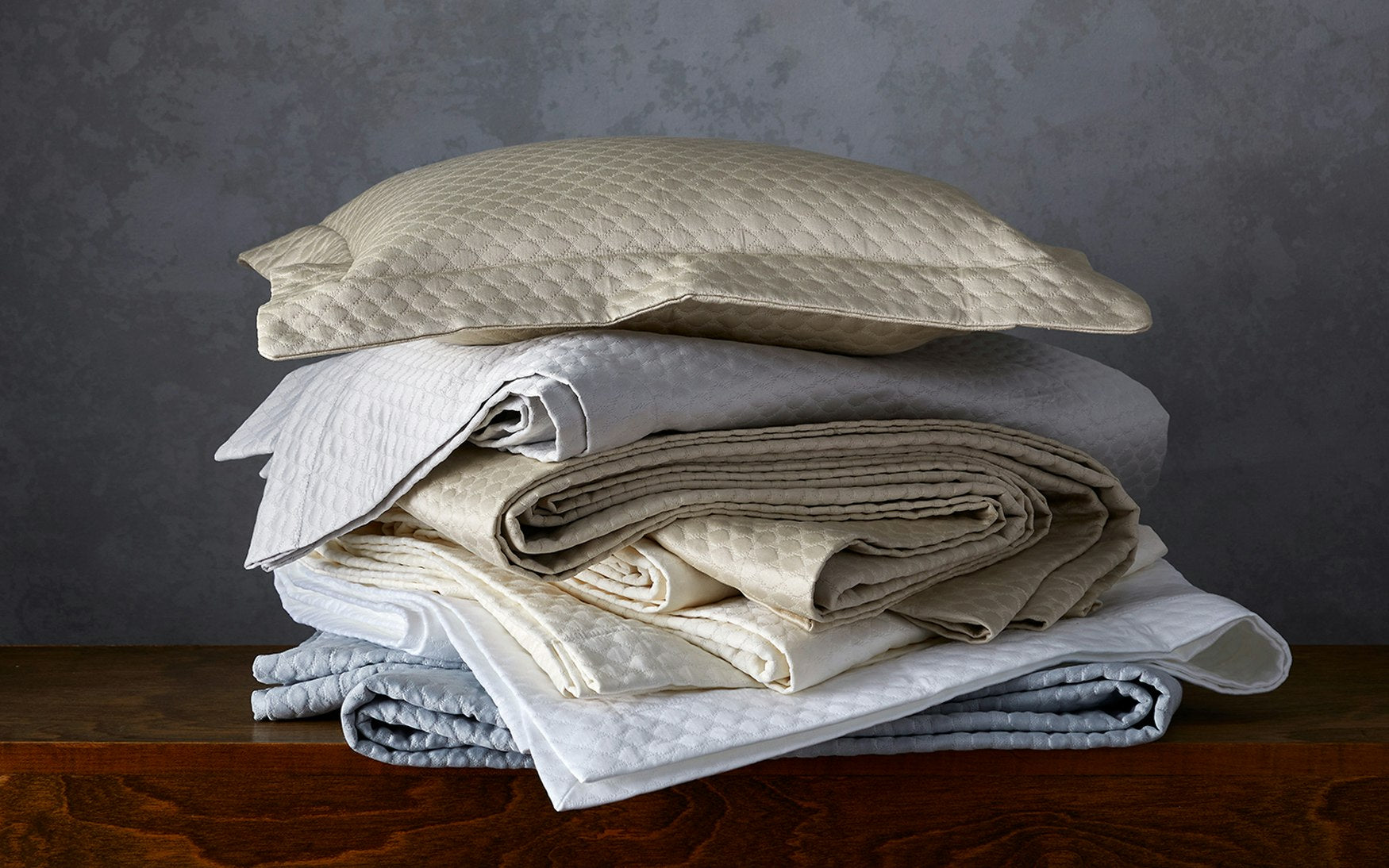 Polished and plush, an opalescent sheen casts our fine textured matelasse in a whole new light. Made from 100% cotton from Italy, the added iridescence imparts a luxurious look and feel.