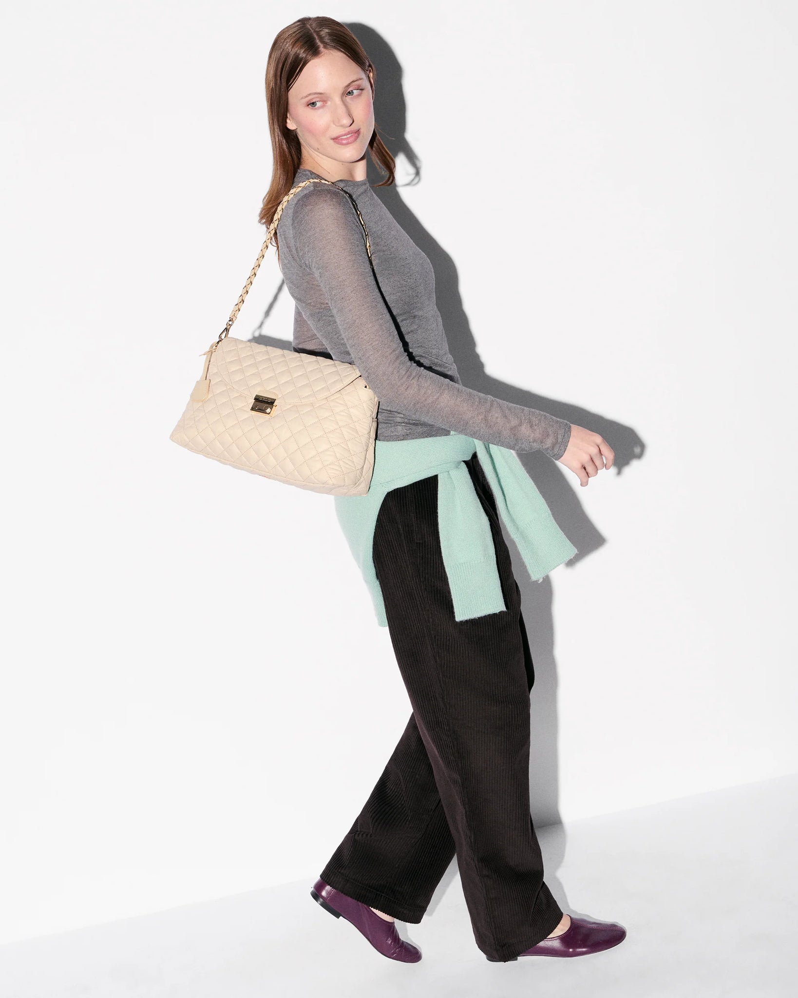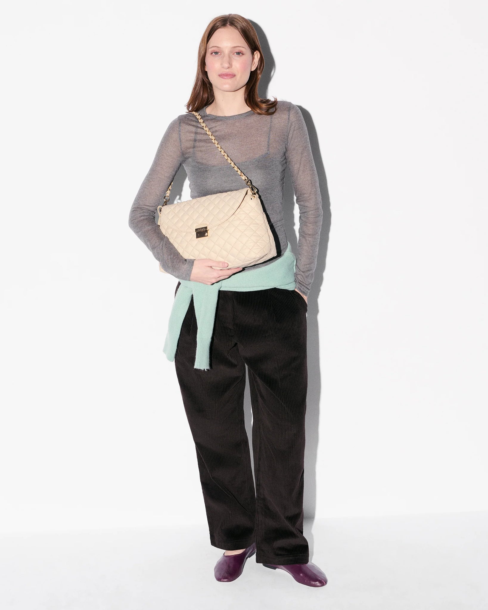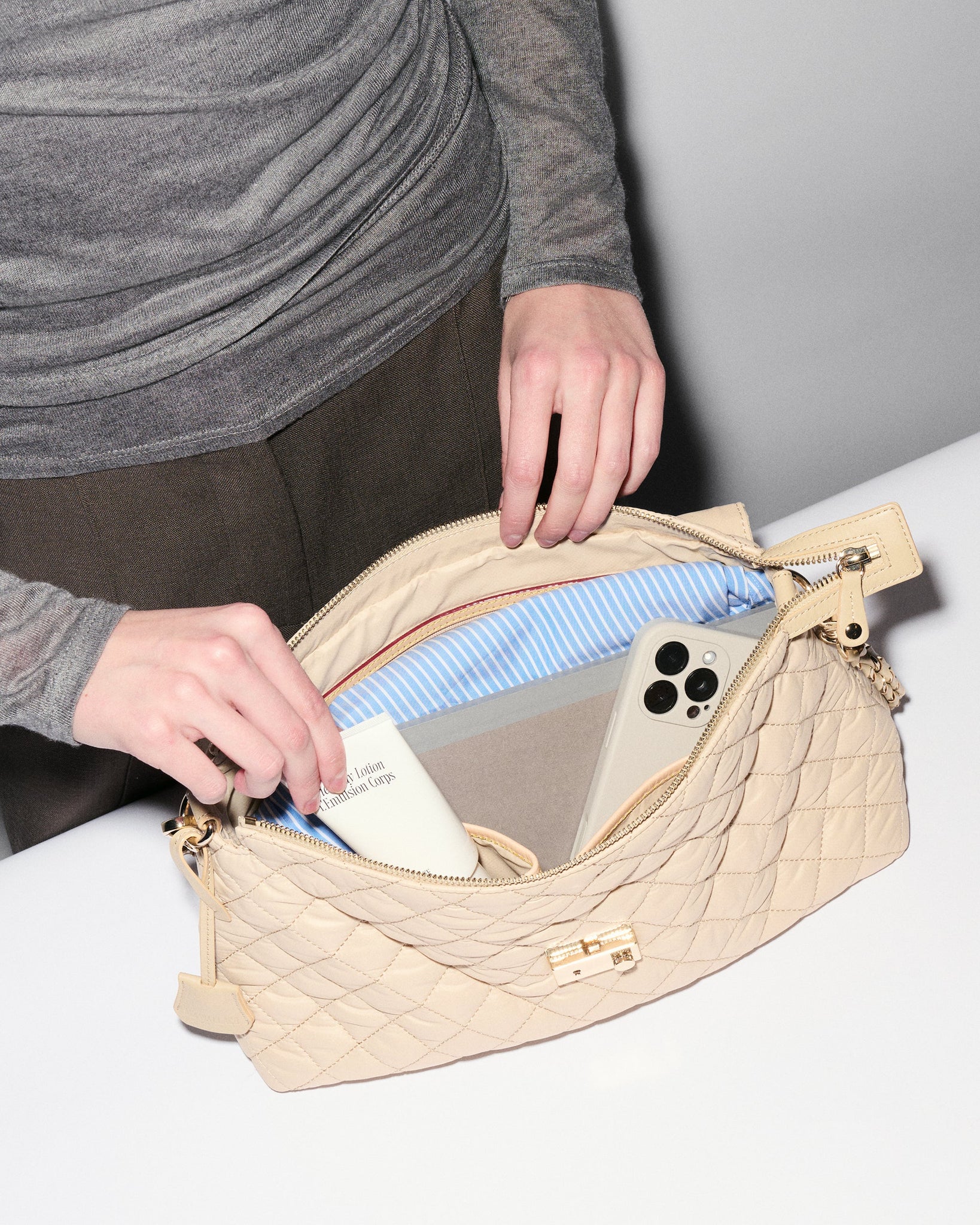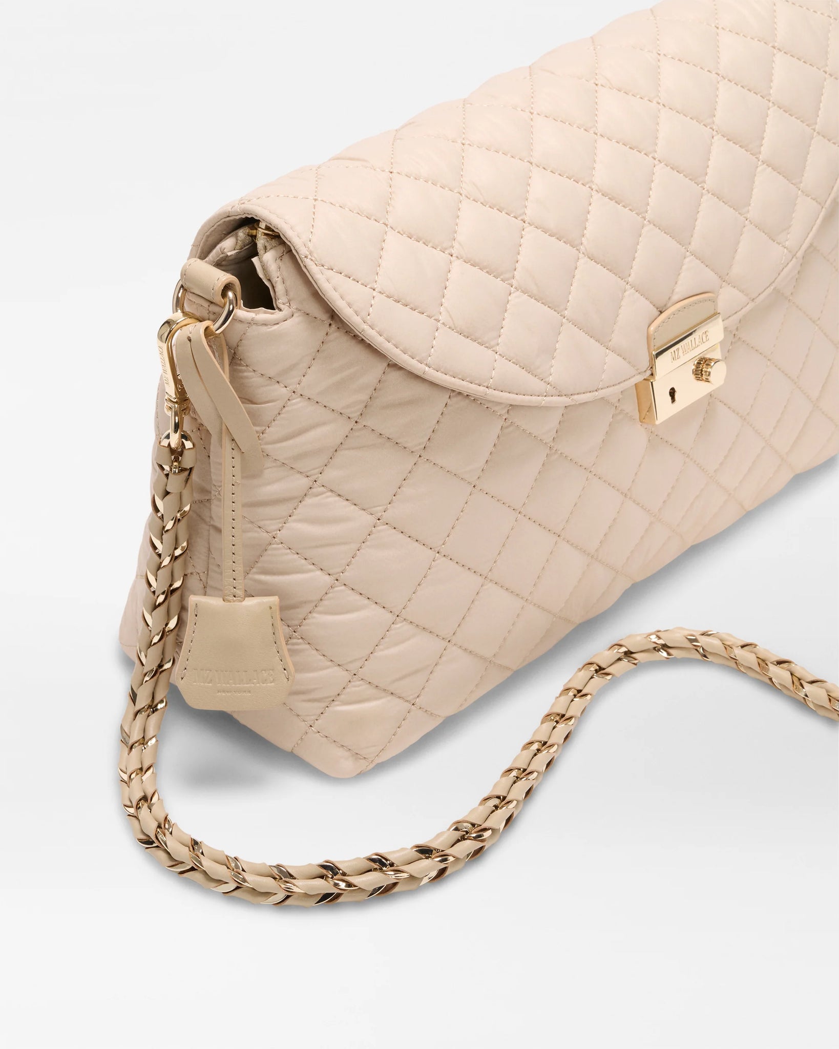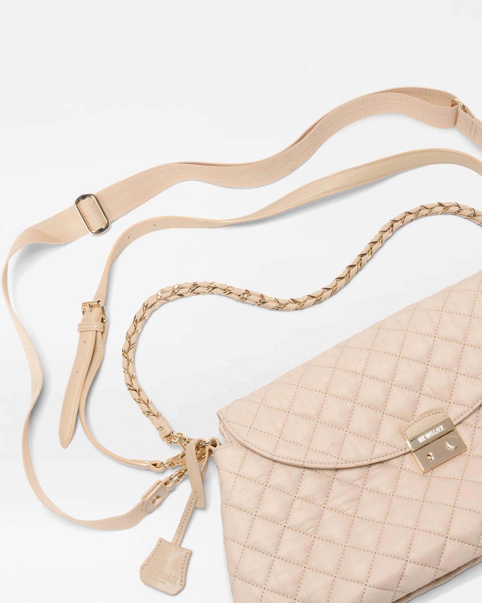 - Hardware: Light gold hardware