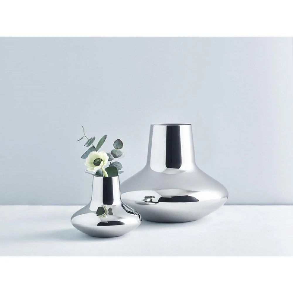 With a bold graphic quality and sense of proportion that makes it look like it is almost floating, this large stainless steel vase exemplifies the beauty of minimalist Scandinavian design. The highly polished surface catches the light and reflects back the bouquet of flowers placed within, adding an extra layer of colour and pattern, but the pure simplicity of the piece means that has sculptural appeal even when stood empty in the centre of a table or on a shelf.